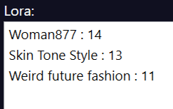 The weird future fashion lora seems to have only effect on her necklace. But that is it. Skin Tone Style is always a nice one when aiming for beauty.