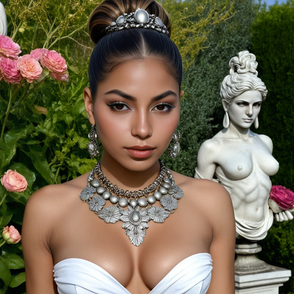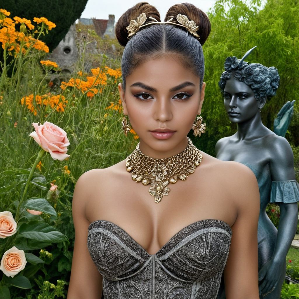 She is in the beautiful garden with flowers and statues. Age 23. Necklace. Detailed skin. Photorealistic. UHD glamour photo. Intrinsic details.