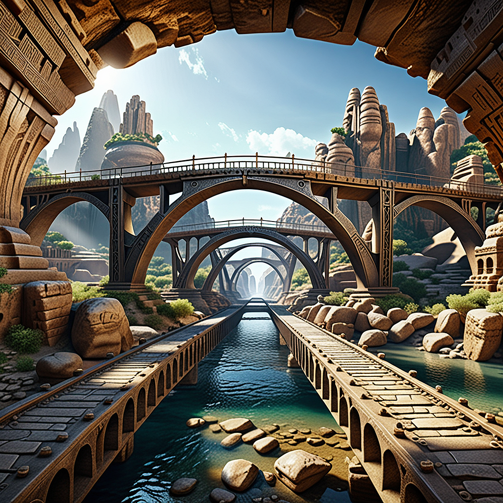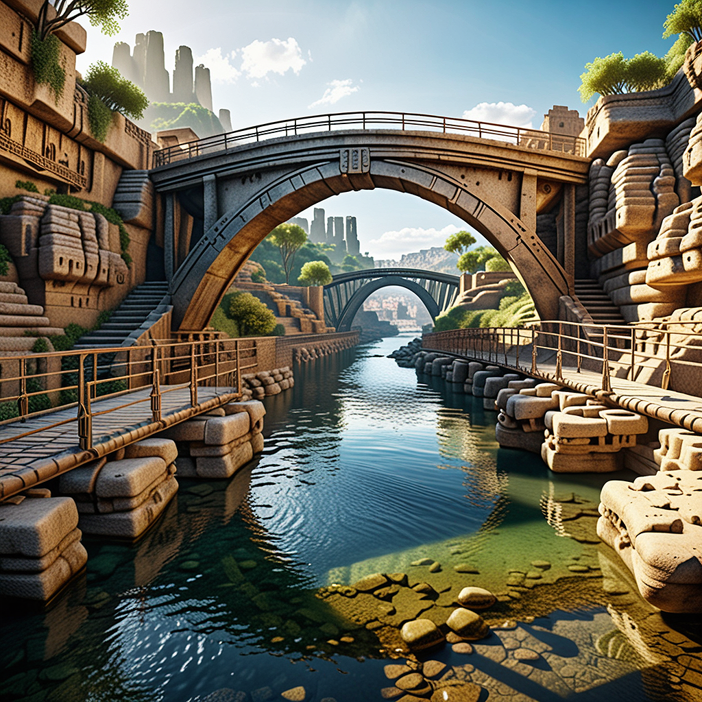The model has difficulties with the "ancient alien city" and the bridge (or bridges) are mostly in a sort of rocky nature. The pictures generated are very fantasy rich. Guidance could be quite a few steps above 10.