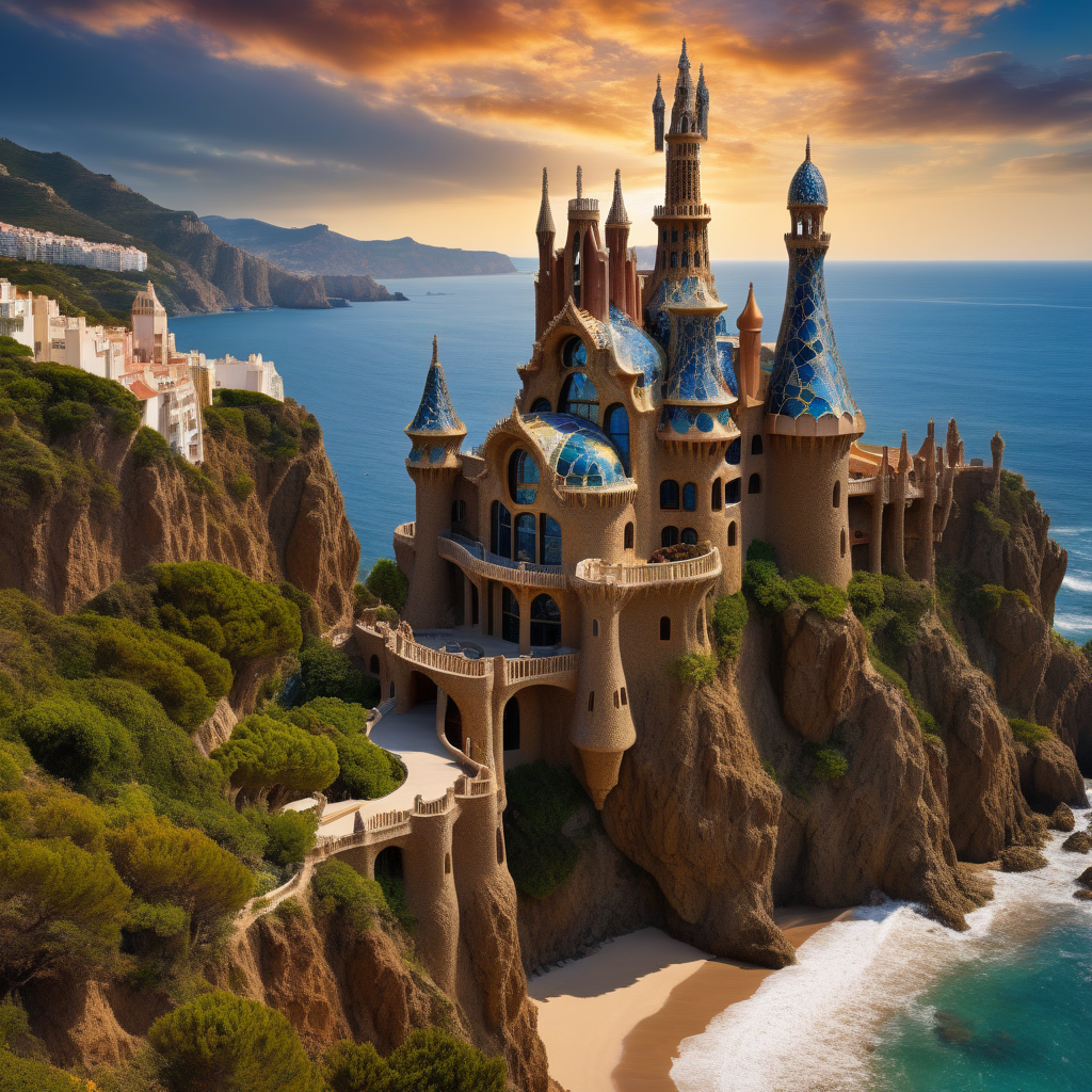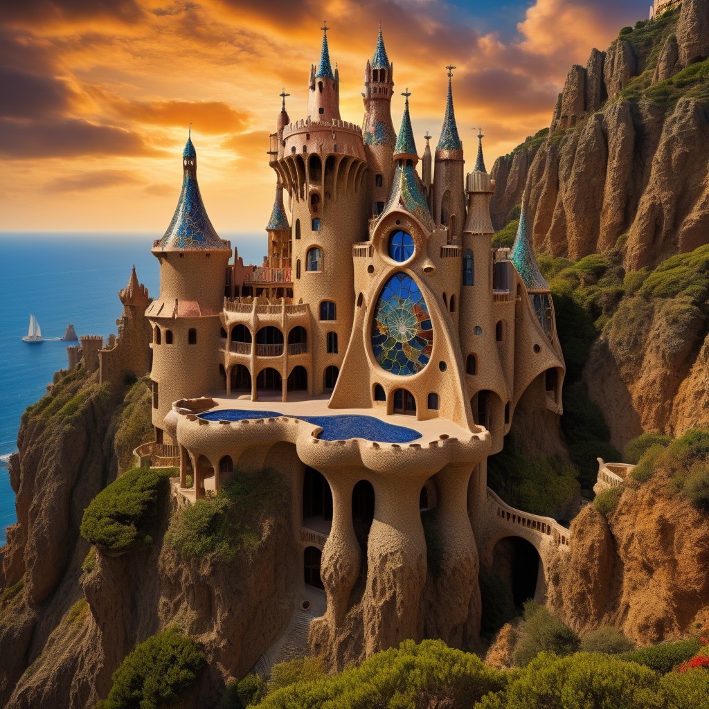 A breathtaking, futuristic castle perched on a dramatic coastal cliff, designed by Antoni Gaudí, blending organic Art Nouveau architecture with surreal, fantastical elements. The castle features intricate mosaics, flowing curves, and stained glass windows glowing with vibrant colors. The surrounding landscape includes crashing waves, golden sunlight reflecting off the ocean, and a vivid sunset with hues of orange, pink, and purple. Lush greenery and exotic flowers cascade down the cliffs, adding life and contrast. The atmosphere is magical, awe-inspiring, and otherworldly, evoking a sense of wonder and grandeur. Perfect composition, dramatic lighting, and an amazing color palette.