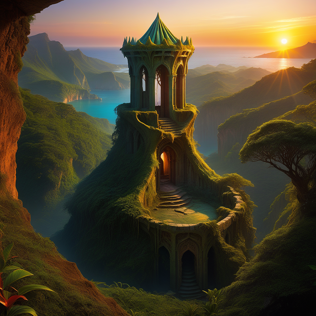 The high ancient tower built by the elves. Painted walls. National Geographic poster photo. Colorful. Futuristic.