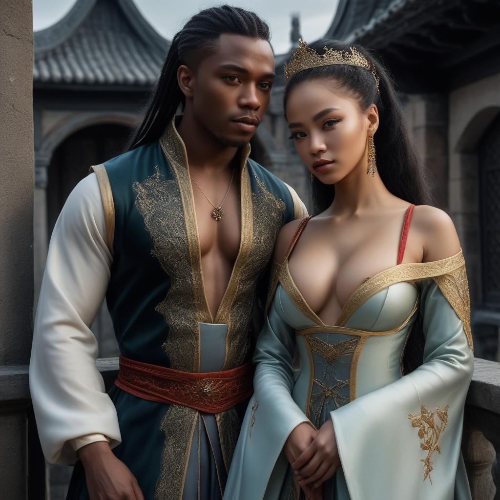 Close up of Hyper-beautiful young negro with Scandinavian woman, colorful fashion based on traditional, formal Chinese hanfu with long, flowing sleeves, mixed with futuristic influences. Detailed natural skin. Very detailed natural eyes.