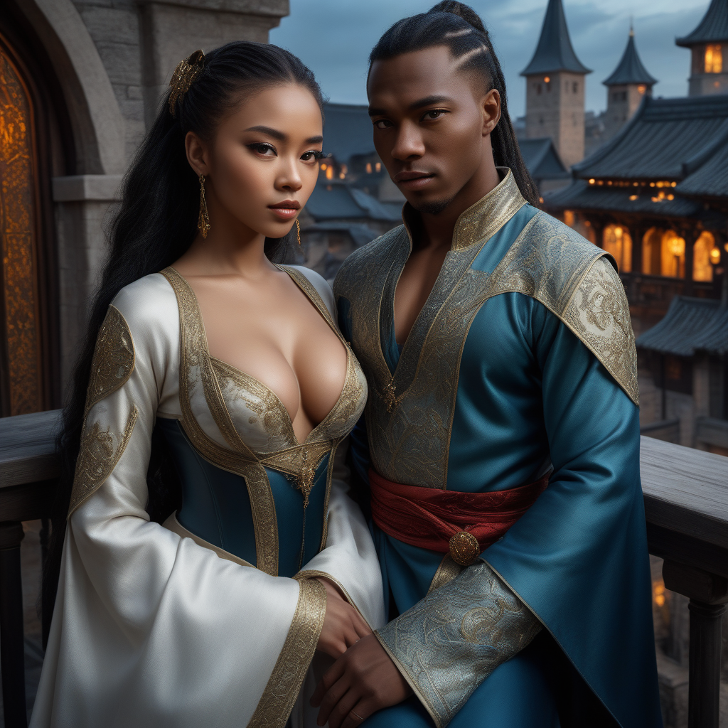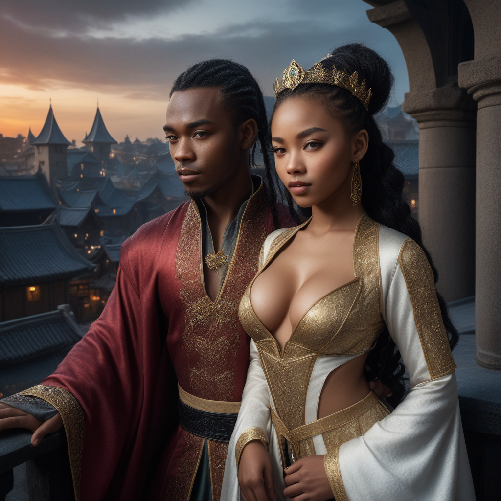 The king and seductive queen, well-shaped with cleavage. At the medieval fantasy world, at the balcony overlooking the nightly fantasy city.