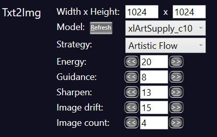 The XL Art Supply model generates often surprising images. I tried to put it to the max with 20 energy, low guidance and sharpen the result. The model needs some tickling but then it could just get in the mood and create magic.