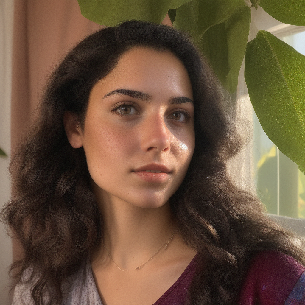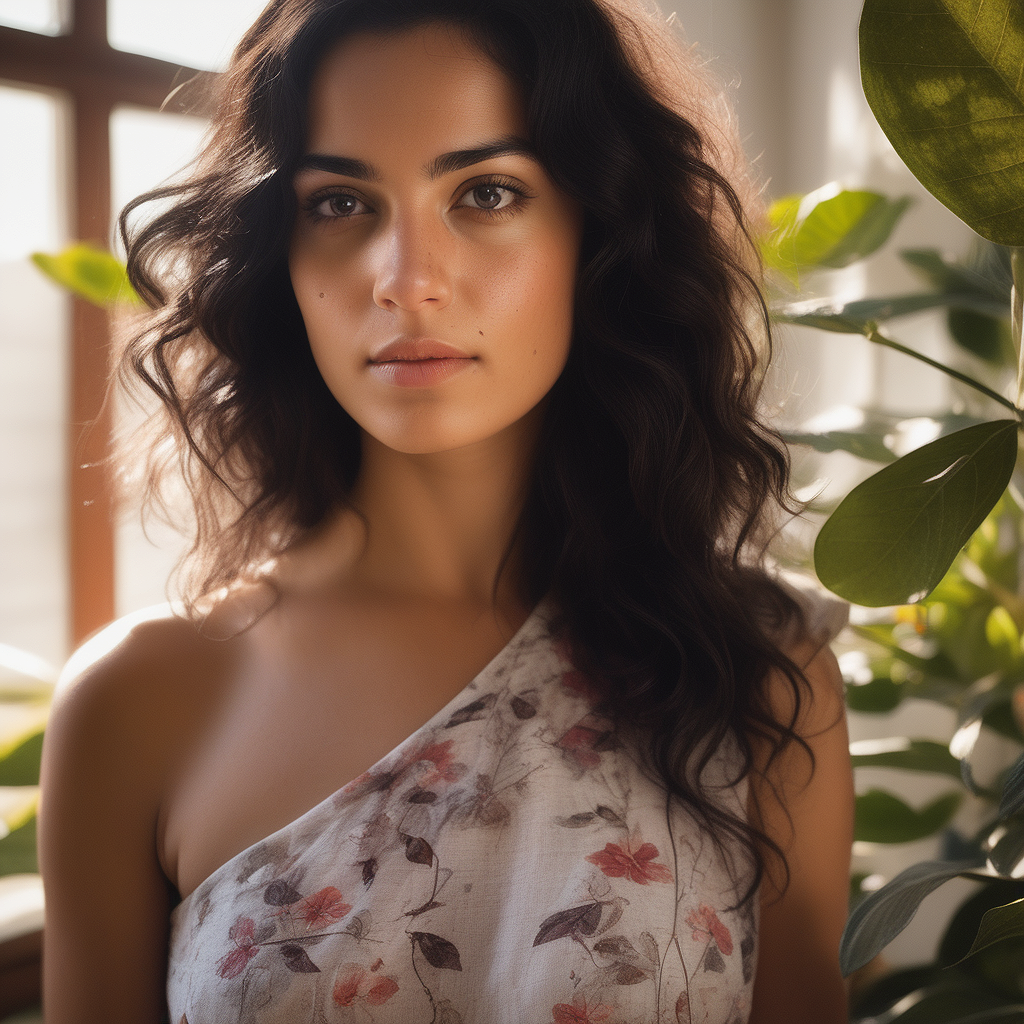 Editorial-style waist-up close up of a young attractive woman, age 23, standing near a large indoor plant, sunlight filtered through curtains.