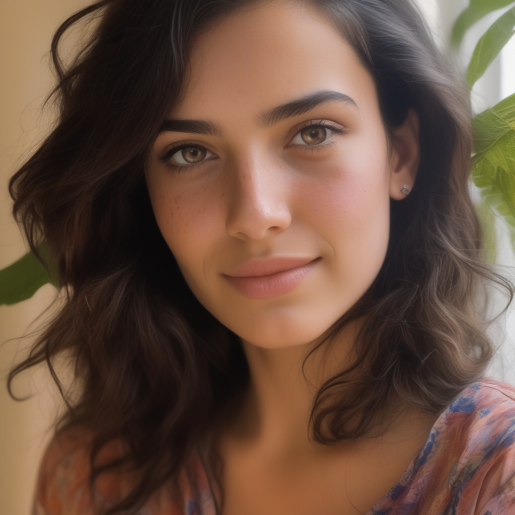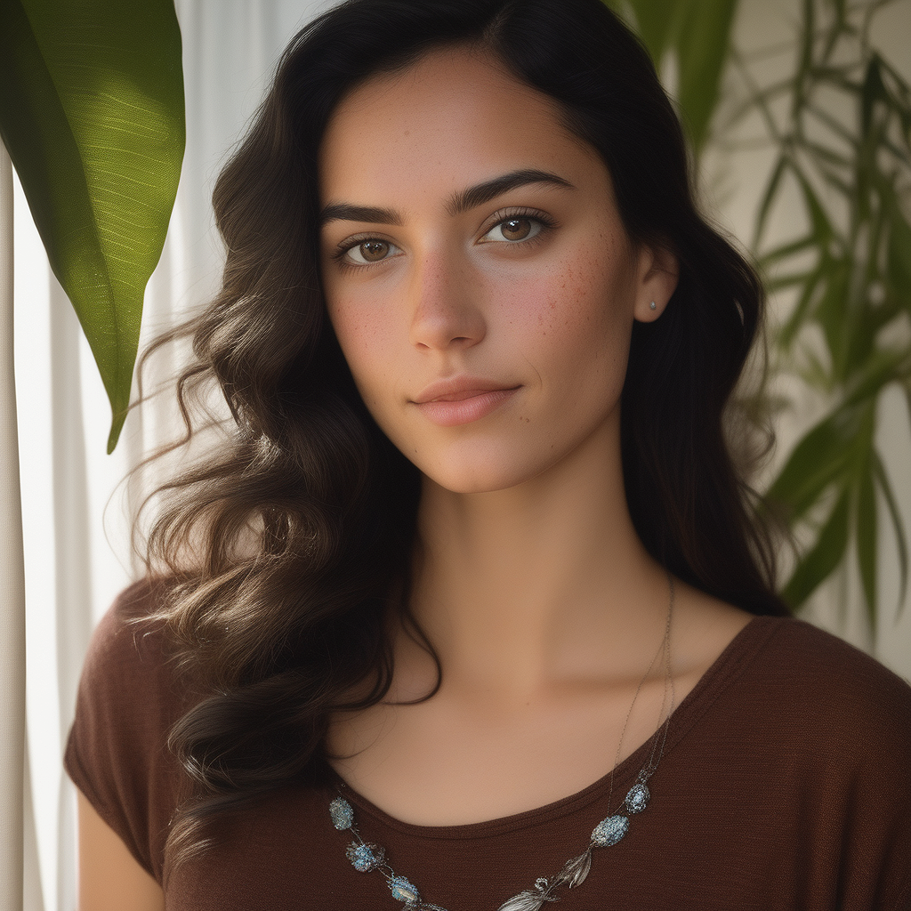 Note this line in the prompt: "warm olive skin with freckles and imperfections." Sometimes people are shown too perfect, as they are dolls. The freckles and imperfections make that effect go away. Freckles work fine in this model, perhaps also because the skin is dark-toned. The number of freckles stays modest.magic.