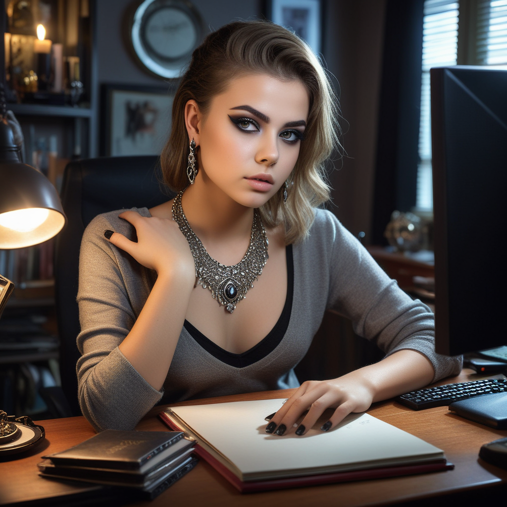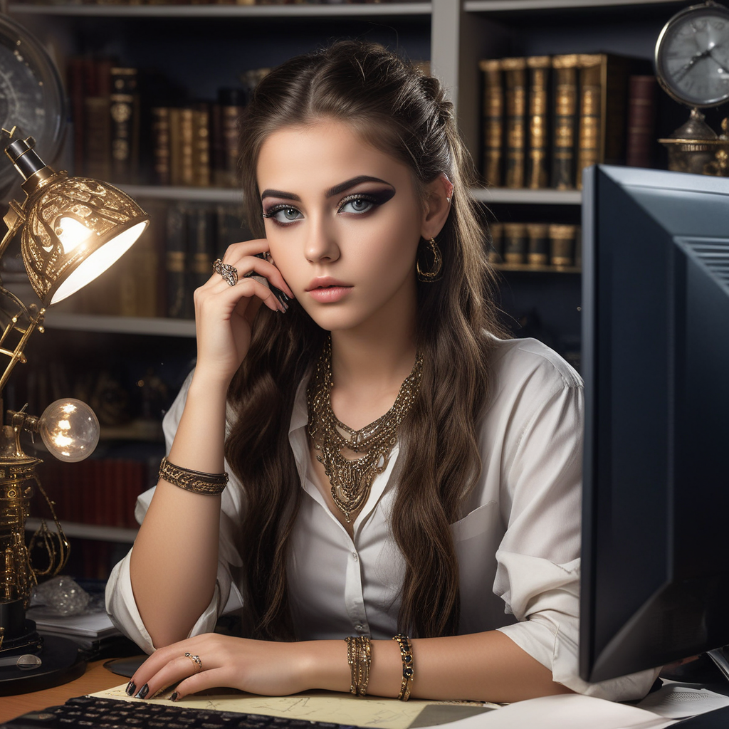 Beautiful attractive young female student, interesting make-up, working in her study room, at her computer.