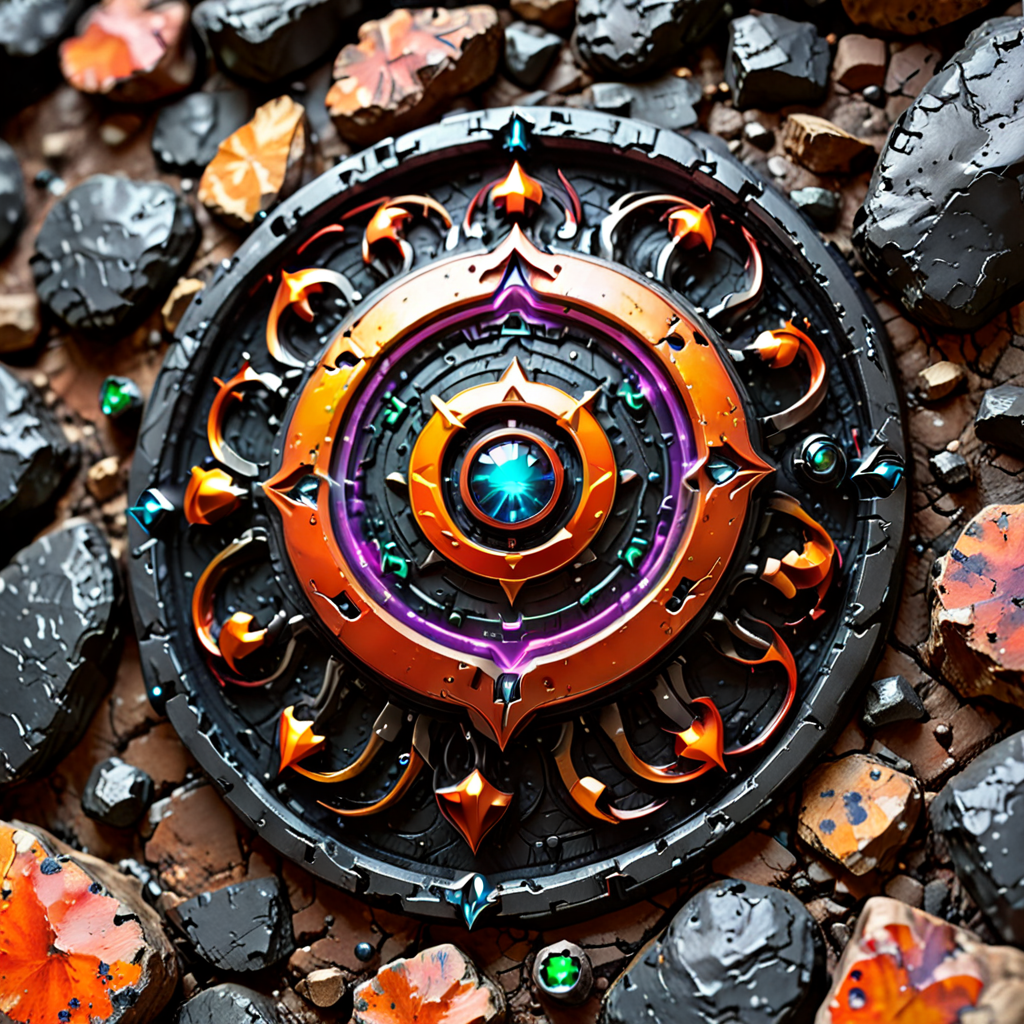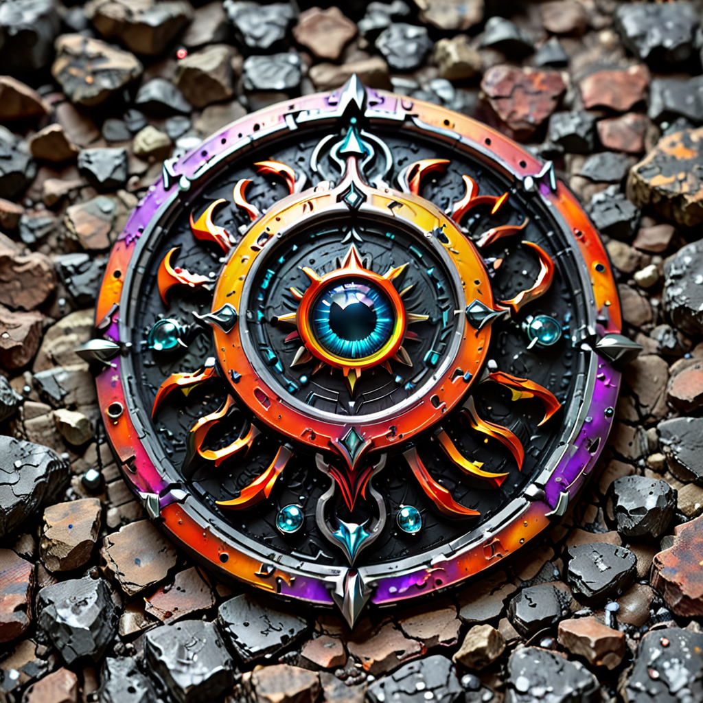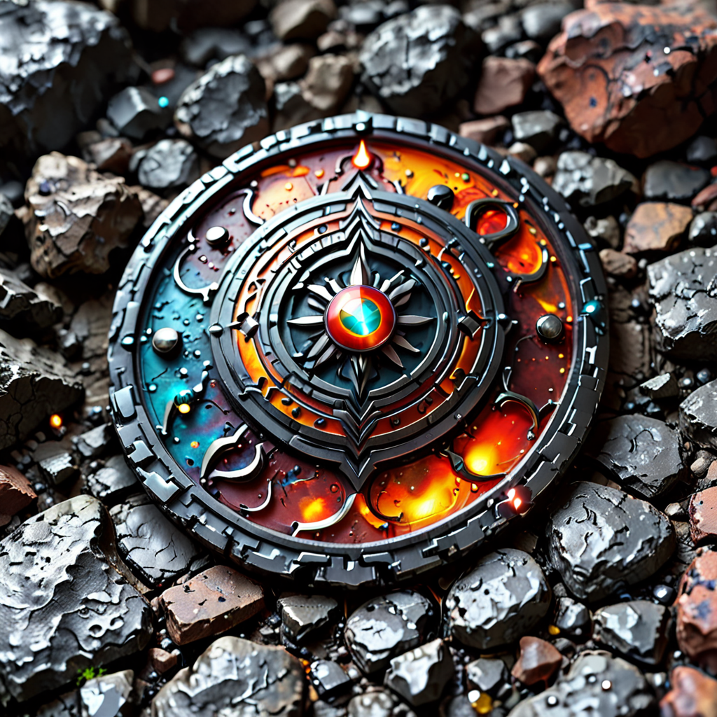 a futuristic metal logo. a magic surface. on a colorful rock wall. Lots of bend metal. Lava.